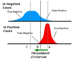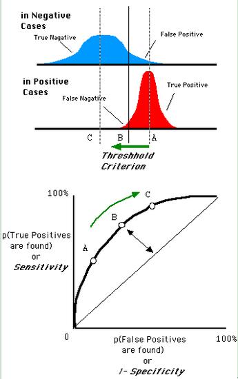 对于0,1两类分类问题,一些分类器得到的结果往往不是0,1这样的标签,如神经网络得到诸如0.5,0.8这样的分类结果。这时,我们人为取一个阈值,比如0.4,那么小于0.4的归为0类,大于等于0.4的归为1类,可以得到一个分类结果。同样,这个阈值我们可以取0.1或0.2等等。取不同的阈值,最后得到的分类情况也就不同。如下面这幅图: