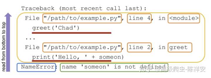 每个 Python 的 Traceback 信息都有几个重要的部分。下图显示了各个组成部分: